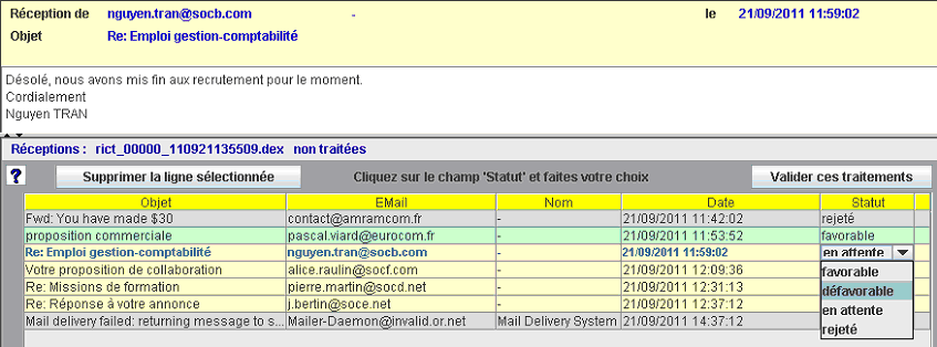 Le logiciel présente les messages reçus dans un double fenêtrage et, pour chacun, invite à choisir un statut : favorable, défavorable, en attente, rejeté.